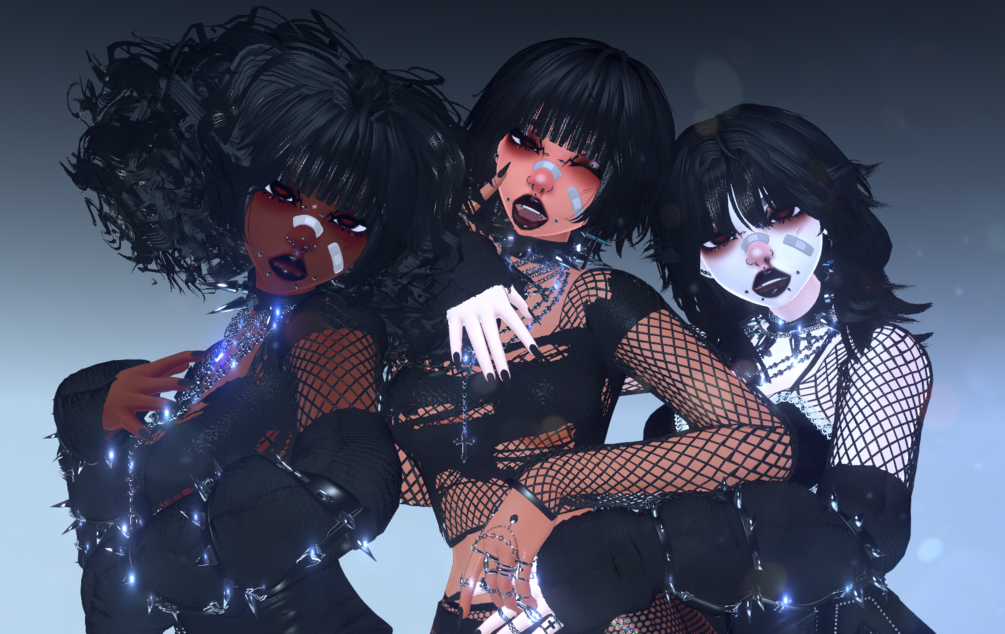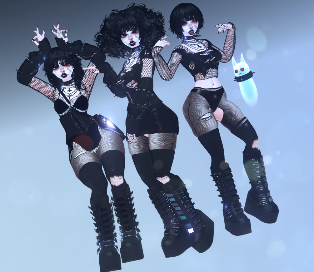 ✩ outfit swap, ripped top, fishnet top, arm warmers, necklaces, coffin bag corset, shoes, face band aids, pasties, panties, ghost follower