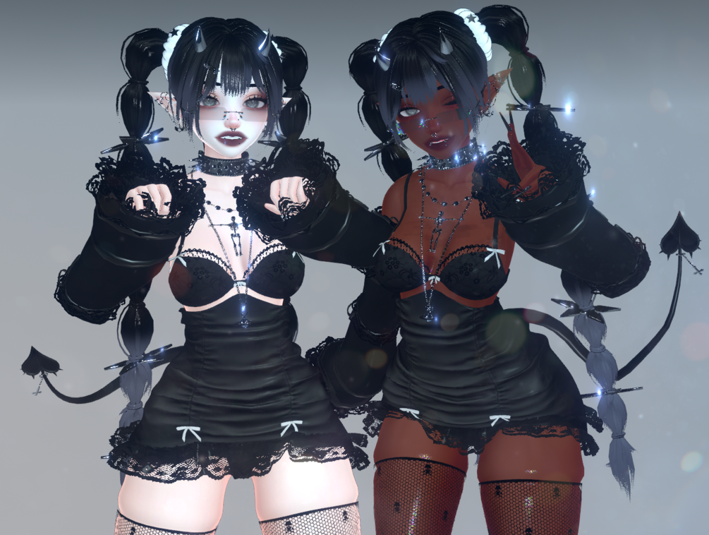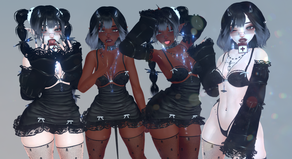 ✩ bra, skirt, thigh highs, hair clip, horns, tail, choker, necklace, sleeves, glasses, shoes, panties, blood pouch
